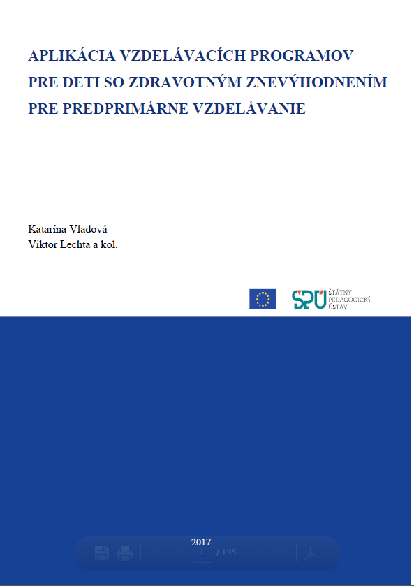 Na základe požiadavky MŠVVaŠ SR Štátny pedagogický ústav realizoval v období od januára do augusta 2018 dotazníkový prieskum aplikácie vzdelávacích programov pre deti so zdravotným znevýhodnením pre predprimárne vzdelávanie, ktoré sú platné od septembra 2017. Dotazníky boli zostavené so zameraním na zmapovanie skúseností a názorov učiteliek/učiteľov materských škôl pri aplikácii uvedených vzdelávacích programov v pedagogickej praxi. Na základe získaných výsledkov z prieskumu, publikácia uvádza závery a odporúčania nielen pre pedagogickú prax, ale aj odporúčania, ktoré môžu byť východiskami pre ďalšie skúmanie a riešenie tejto závažnej problematiky.